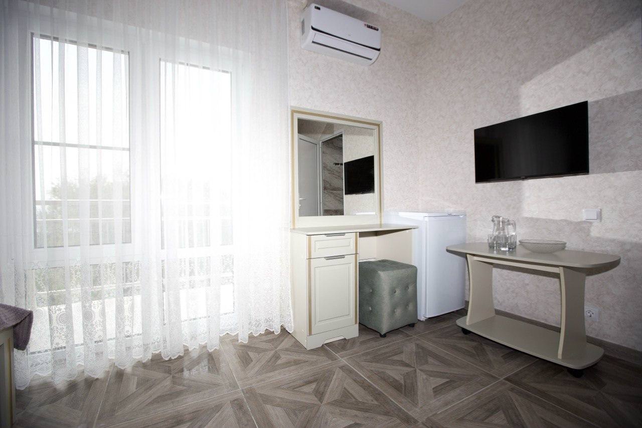 Трехместные номера с широкой двуспальной кроватью и односпальной кроватью. В номерах есть все необходимое для комфортного отдыха: туалетный стол, зеркало, чайная посуда, шкаф, сейф, холодильник и ЖК телевизор. Индивидуальный санузел оборудован душем. В стоимость номера входит бесплатный Wi-Fi.
