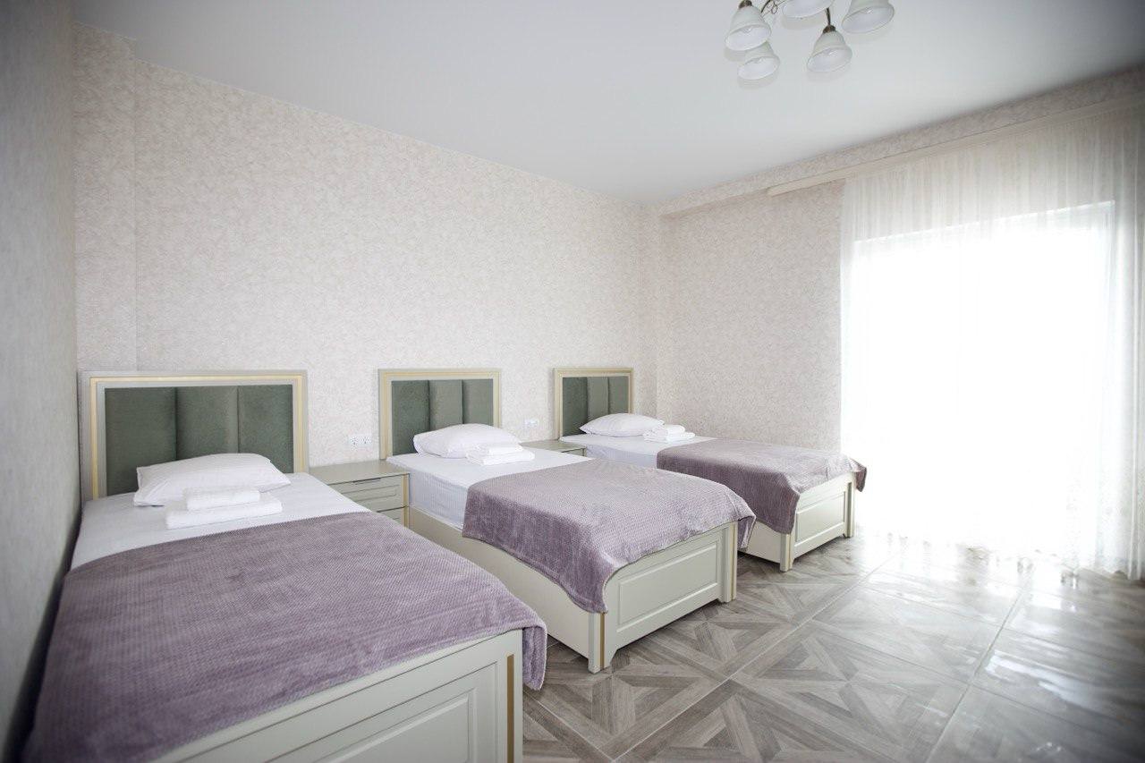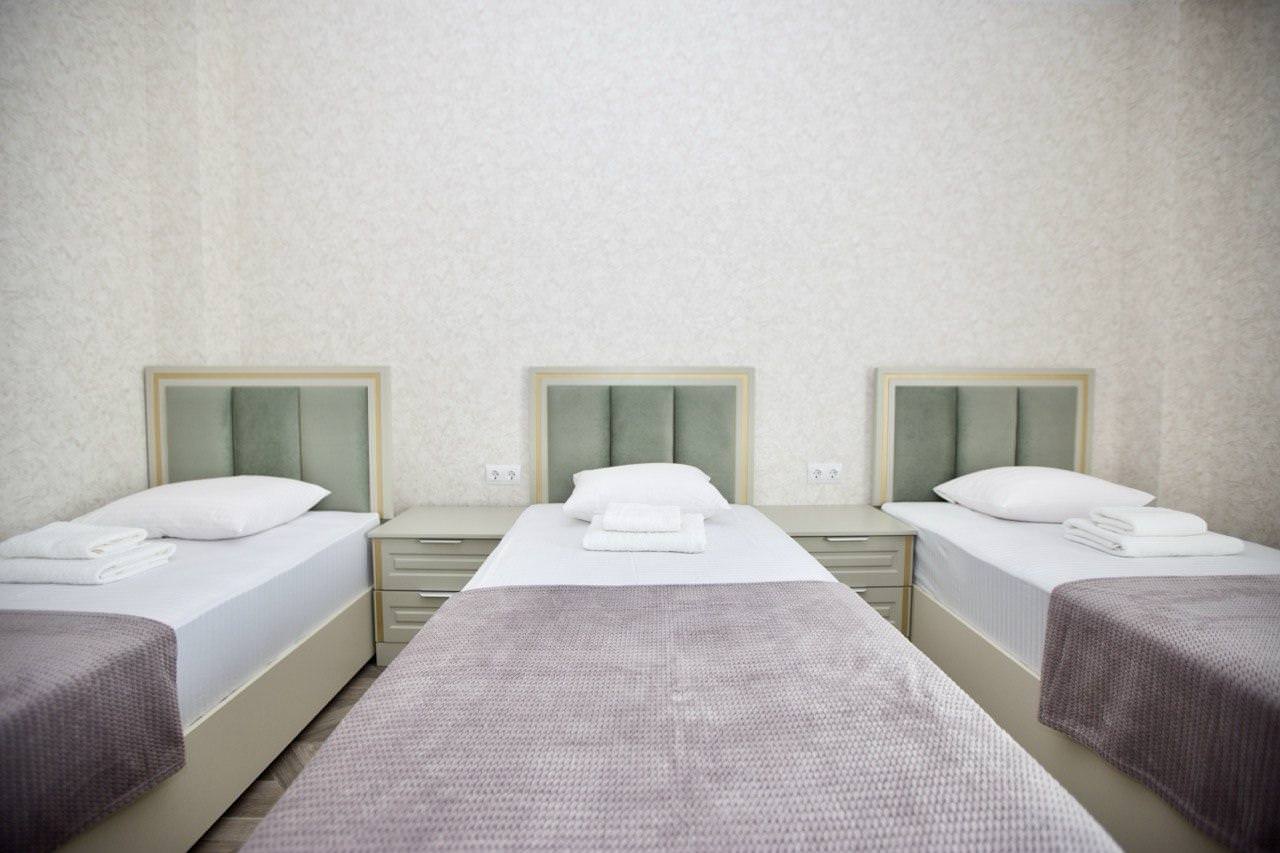 Трехместные номера с 3 отдельными односпальными кроватями. В номерах есть все необходимое для комфортного отдыха: туалетный стол, зеркало, чайная посуда, шкаф, сейф, холодильник и ЖК телевизор. Индивидуальный санузел оборудован душем. В стоимость номера входит бесплатный Wi-Fi.