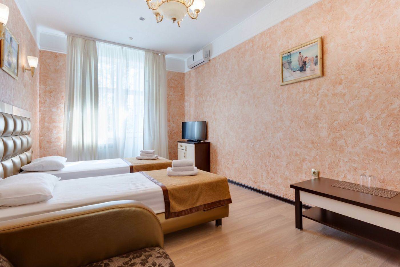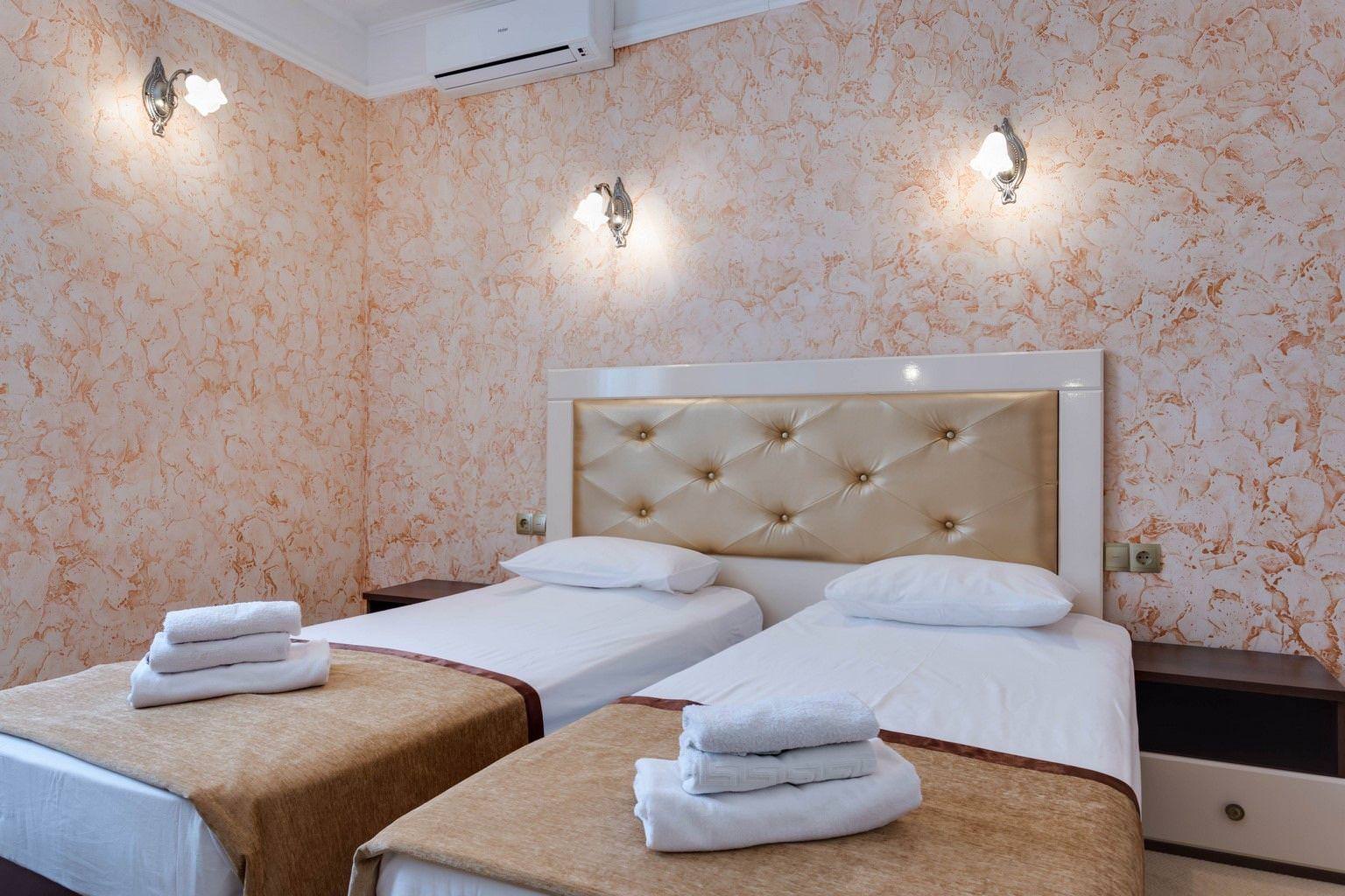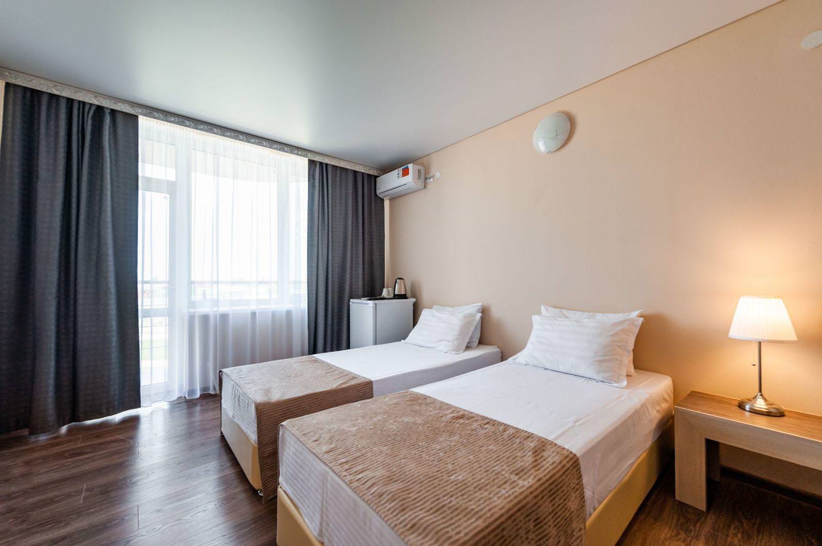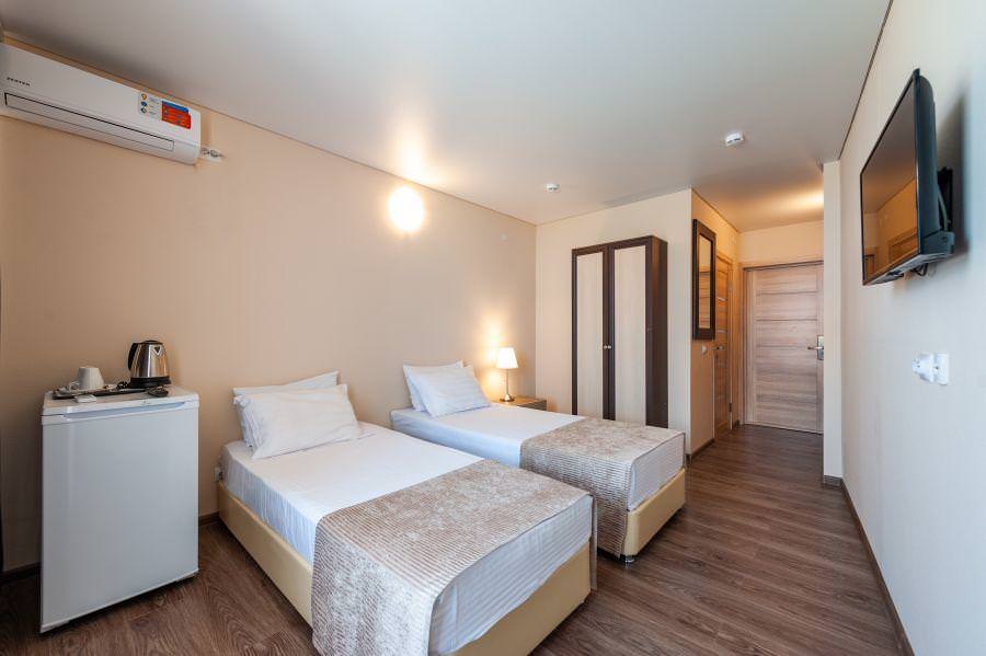 Двухместные номера с 2 отдельными комфортными кроватями. В номере есть раскладное кресло, туалетный стол, зеркало, чайная посуда, шкаф, сейф, холодильник и ЖК телевизор. Индивидуальный санузел оборудован душем. В стоимость номера входит бесплатный Wi-Fi.